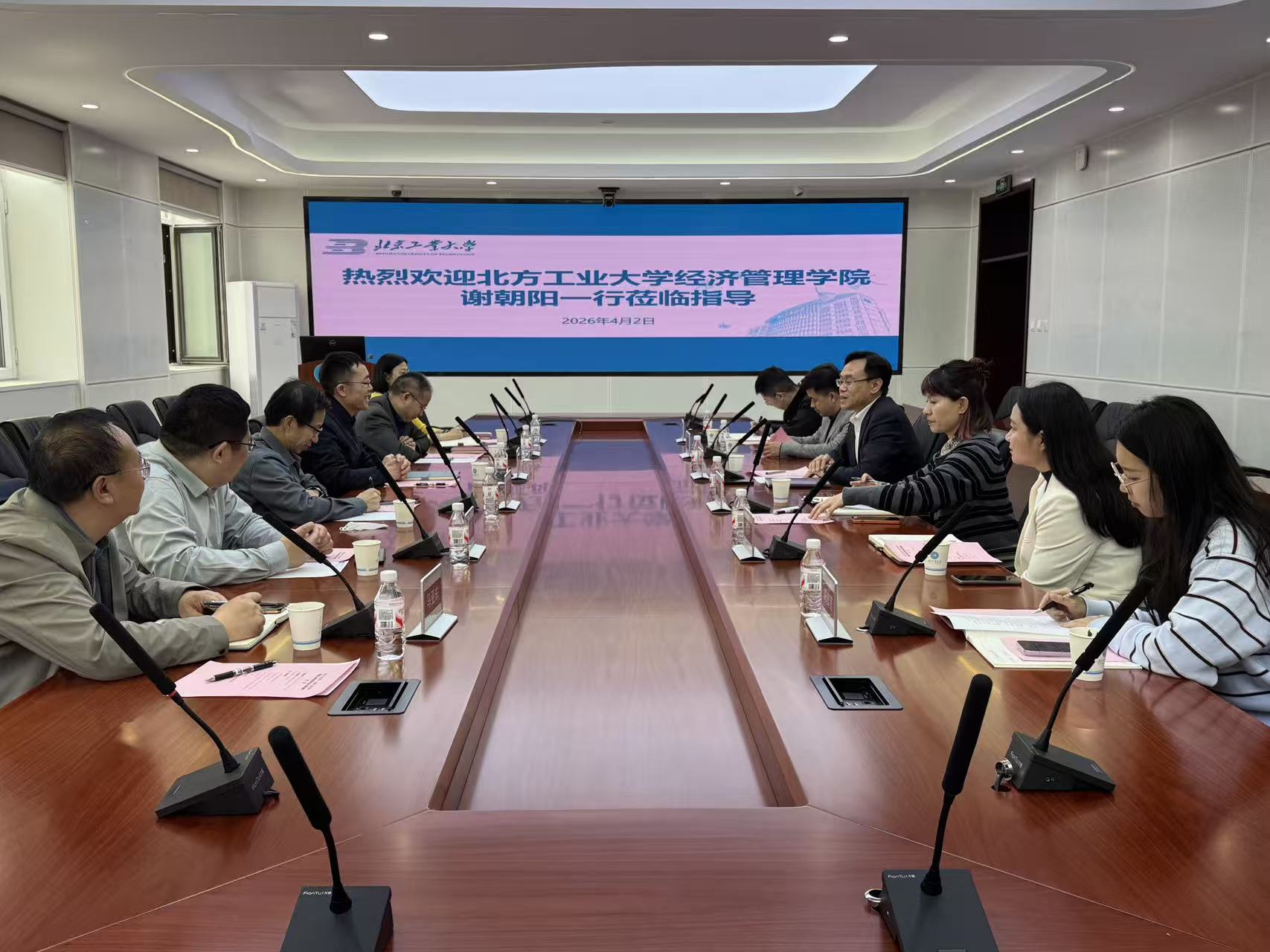 为精准谋划“十五五”发展蓝图,深化校际交流合作,以党建引领推动学院高质量发展,4月2日下午,北方工业大学经济管理学院党委书记谢朝阳带队,院党委委员及各系负责人一行,赴北京工业大学经济与管理学院开展“十五五”规划专题调研。本次调研会由北京工业大学经管学院党委书记张彦军主持,双方围绕学院发展核心议题展开深度交流研讨。