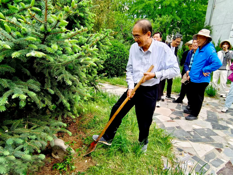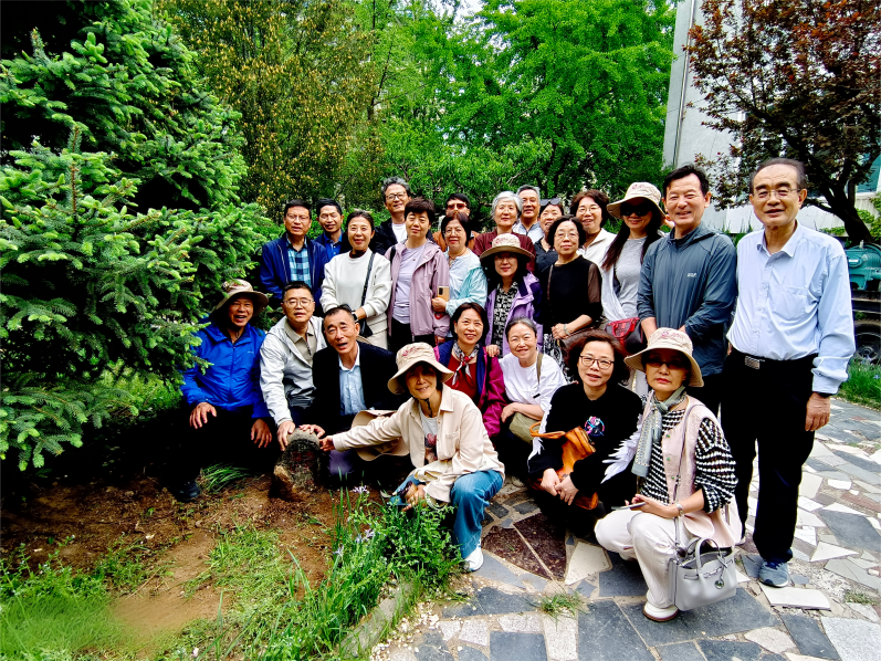 随后,校友们前往校园西北角的纪念林,寻找并看望了四十年前亲手栽下的树木。众人手持剪刀,认真修剪枝叶,并纷纷在树下合影留念。时光荏苒,当初的幼苗已长成参天大树,恰如校友们从青涩学子成长为各行各业的中坚力量。