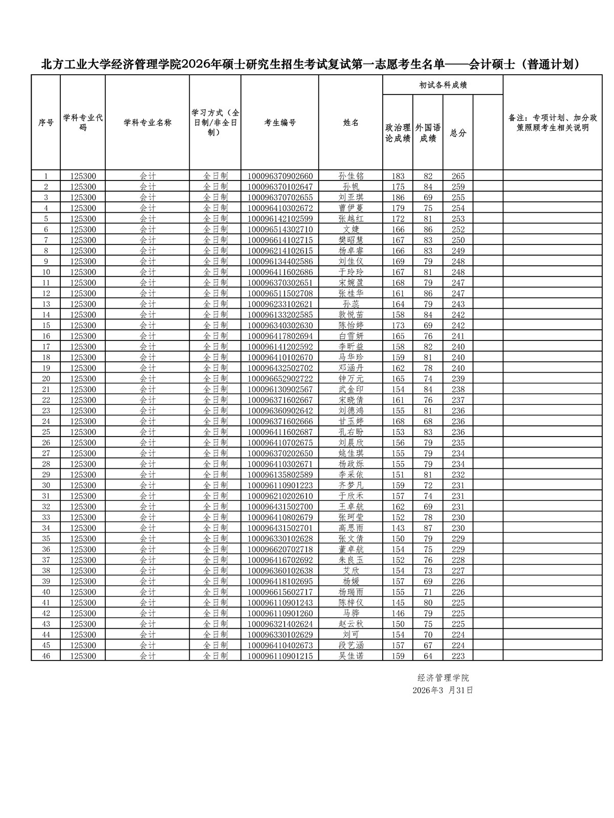北方工业大学经济管理学院2026年硕士研究生招生考试复试第一志愿考生名单——会计硕士(普通计划)