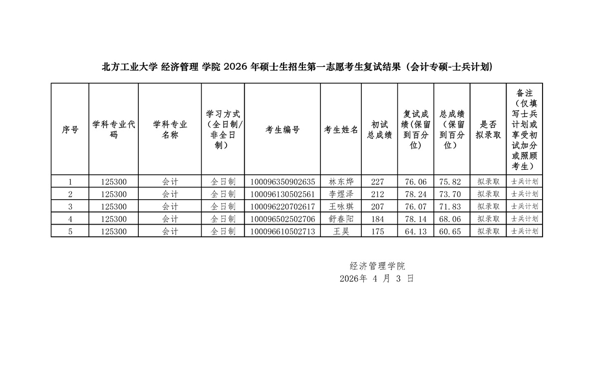 下一条: 北方工业大学经济管理学院2026年硕士生招生第一志愿考生复试结果(会计专硕-普通计划)