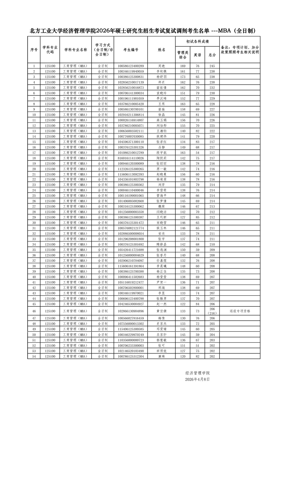 北方工业大学经济管理学院2026年硕士研究生招生考试复试调剂考生名单 ---MBA(全日制)
