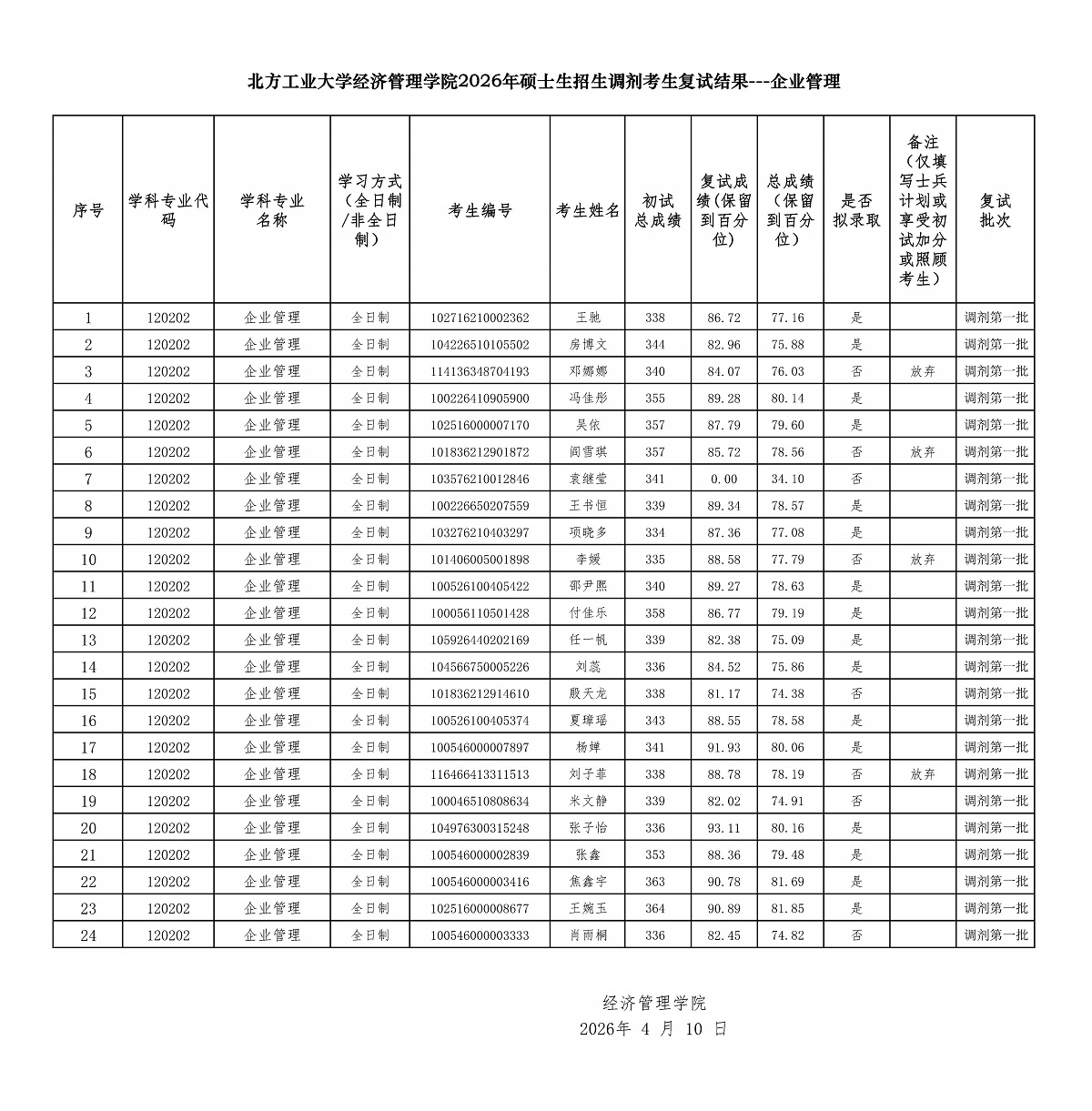北方工业大学经济管理学院2026年硕士生招生调剂考生复试结果---企业管理